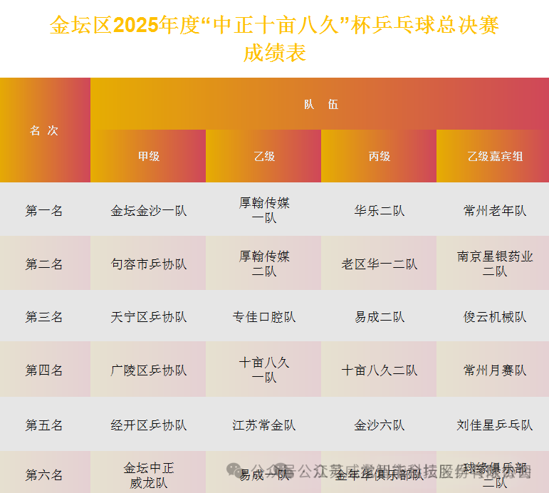 冬日暖阳映照赛场,银球飞舞点燃激情。近日,由常州市乒乓球协会、常州市金坛区体育总会指导,常州市金坛区乒乓球协会主办,金坛区金沙乒乓球俱乐部协办,江苏威龙智能科技股份有限公司、贵州省仁怀市茅台镇中正酒业有限公司、常州应昌新农业科技有限公司联合赞助的2025年度“中正十亩八久”杯乒乓球总决赛在金坛区圆满收官。来自全区各俱乐部、企事业单位及民间的乒乓球爱好者齐聚赛场,以球为媒切磋技艺,用热爱诠释体育精神,为年度乒乓赛事画上圆满句号。